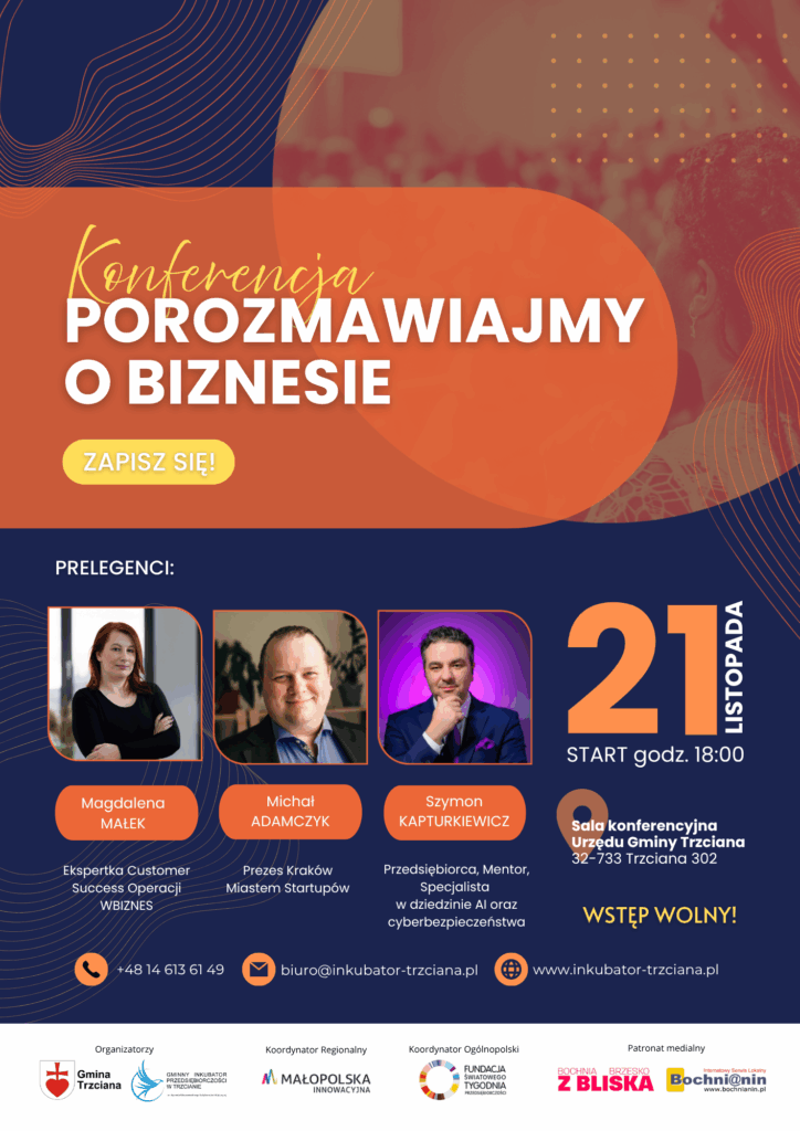 W tym roku skupimy się na realnych wyzwaniach współczesnych przedsiębiorców – od innowacji i wykorzystywania sztucznej inteligencji, przez budowanie marki osobistej, po zarządzanie relacjami z klientami i skalowanie biznesu w sposób zrównoważony. Wydarzenie organizowane w ramach Światowego Tygodnia Przedsiębiorczości w Małopolsce.
